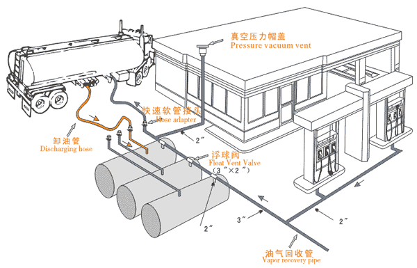 2、通過卸油管、回氣管、快速接頭等將油罐車和地下儲油罐組成密閉系統(tǒng);