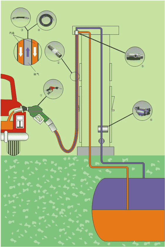 1、油氣回收槍;2、同軸拉斷閥;3、油氣回收膠管;4、油氣回收膠管;5、油氣分離接頭;6、油氣回收泵